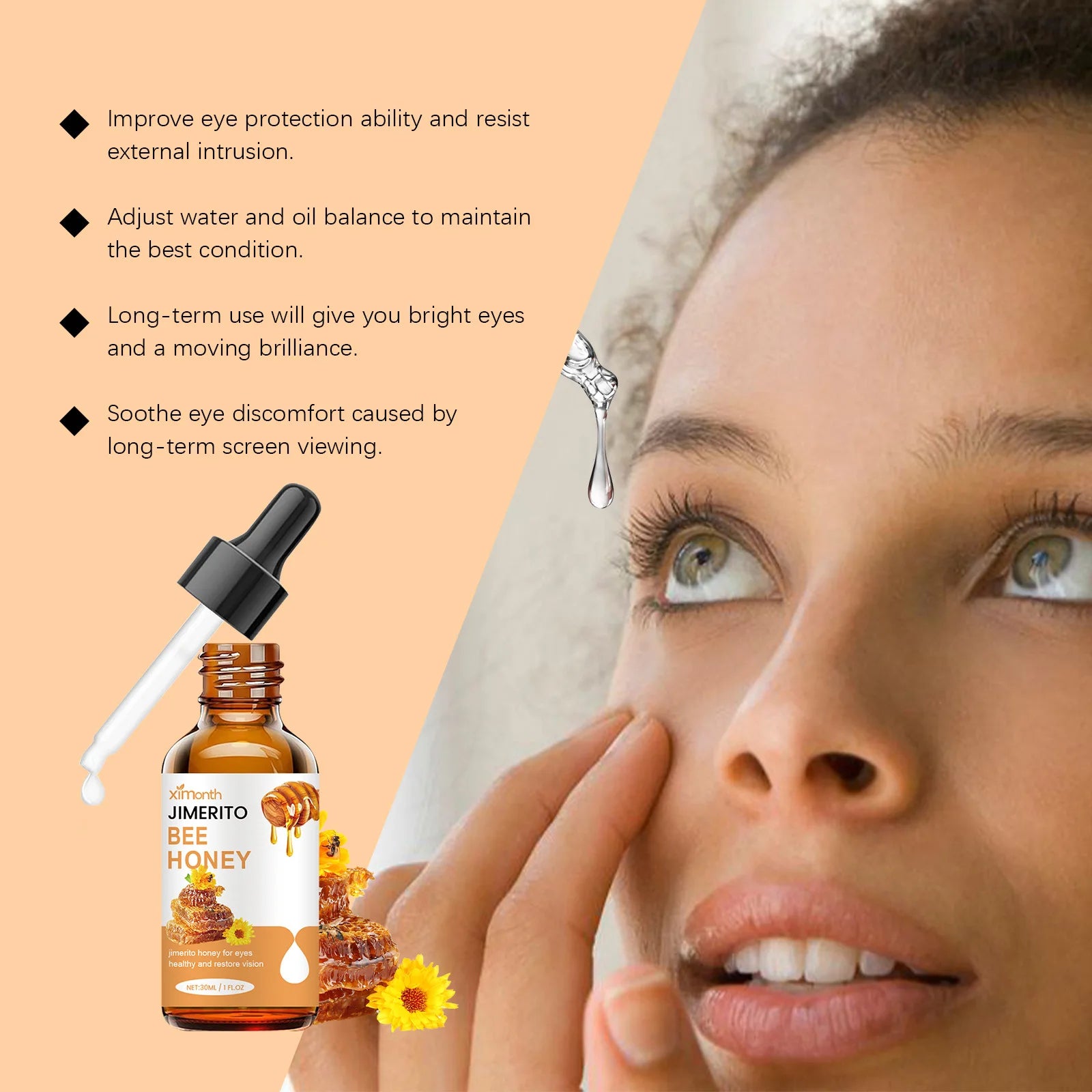Ximonth Bee Honey Eye Drops deliver targeted relief for tired, dry, and strained eyes. Formulated with natural honey extract, these drops soothe irritation while addressing common vision concerns including astigmatism and blurred vision. The refreshing formula works to reduce fatigue and promote clearer eyesight through gentle, nourishing care. Ideal for extended screen time or environmental stress, this eye care solution provides immediate comfort and long-term support for optimal eye health. Available in 30ml and 60ml sizes for convenient daily use.